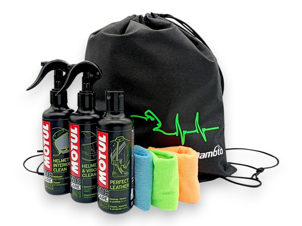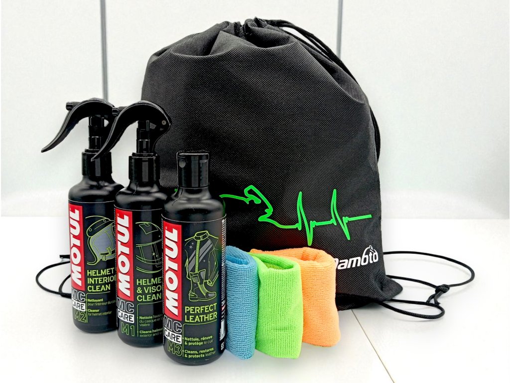 Set na údržbu helmy a koženého vybavení. Vhodné jako vánoční dárek pro motorkáře.