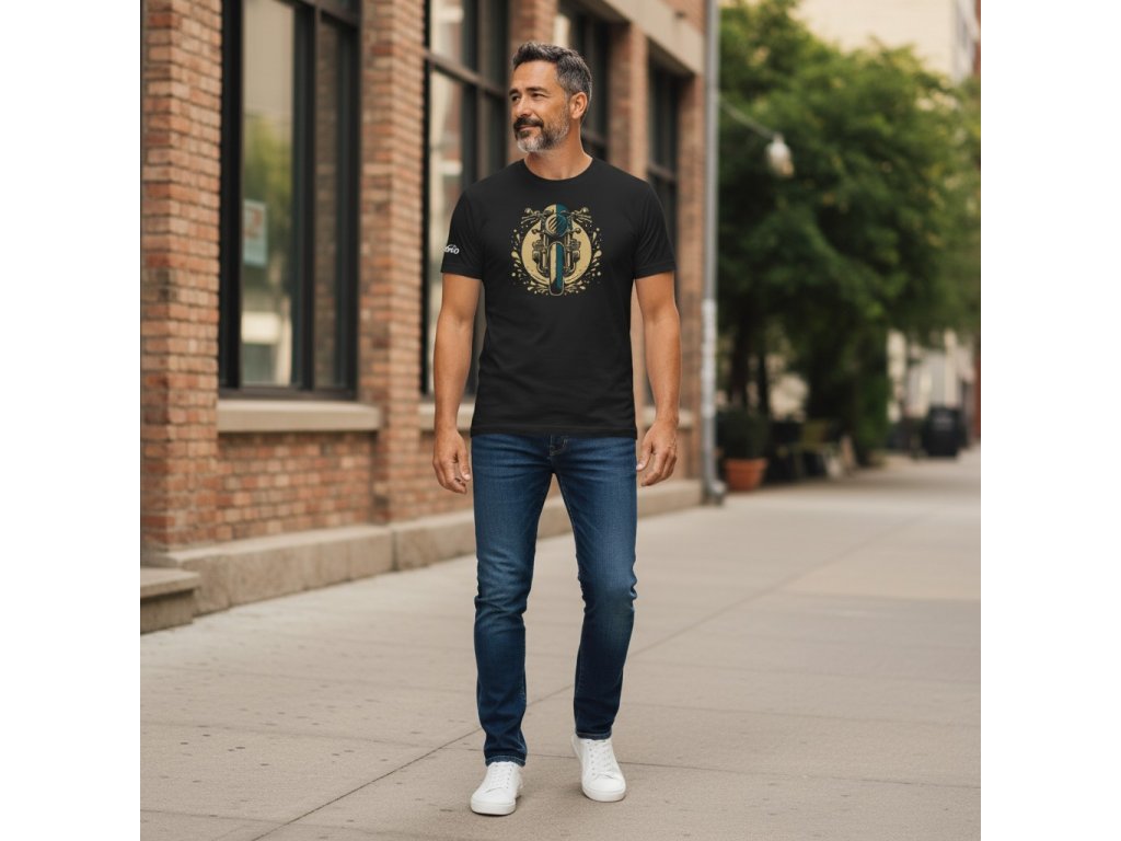 Pánské tričko s krátkým rukávem a kulatým výstřihem. Lemovka u krku je s příměsí pružného elastanu. Zpevňující vnitřní lemovka na krku a ramenou. Dvojité prošití u výstřihu, rukávech a spodním okraji. Bez postranních švů.