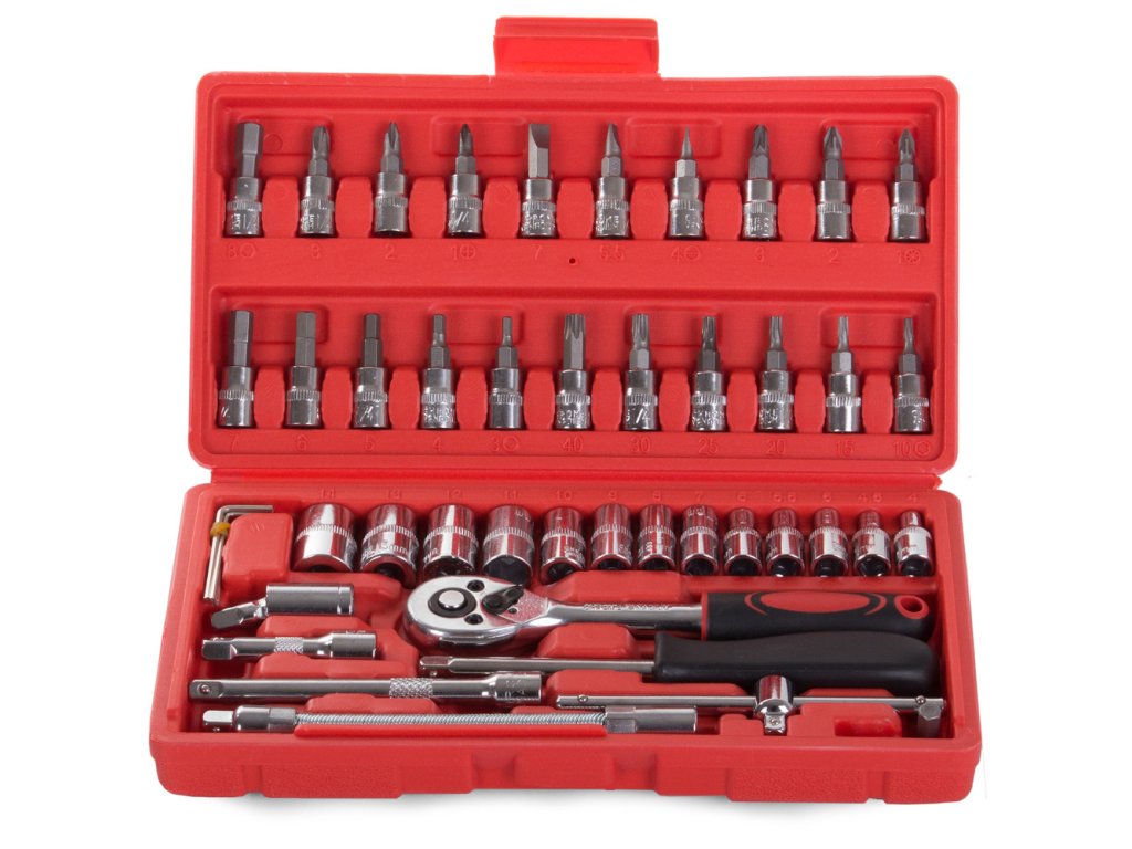 Praktická 46dílná sada nářadí je ideální pro dílnu, domácí opravy i menší servisní práce na autě či motorce. Díky širokému výběru nástavců, bitů a příslušenství zvládnete vše od drobných oprav interiéru až po práce na zahradě.