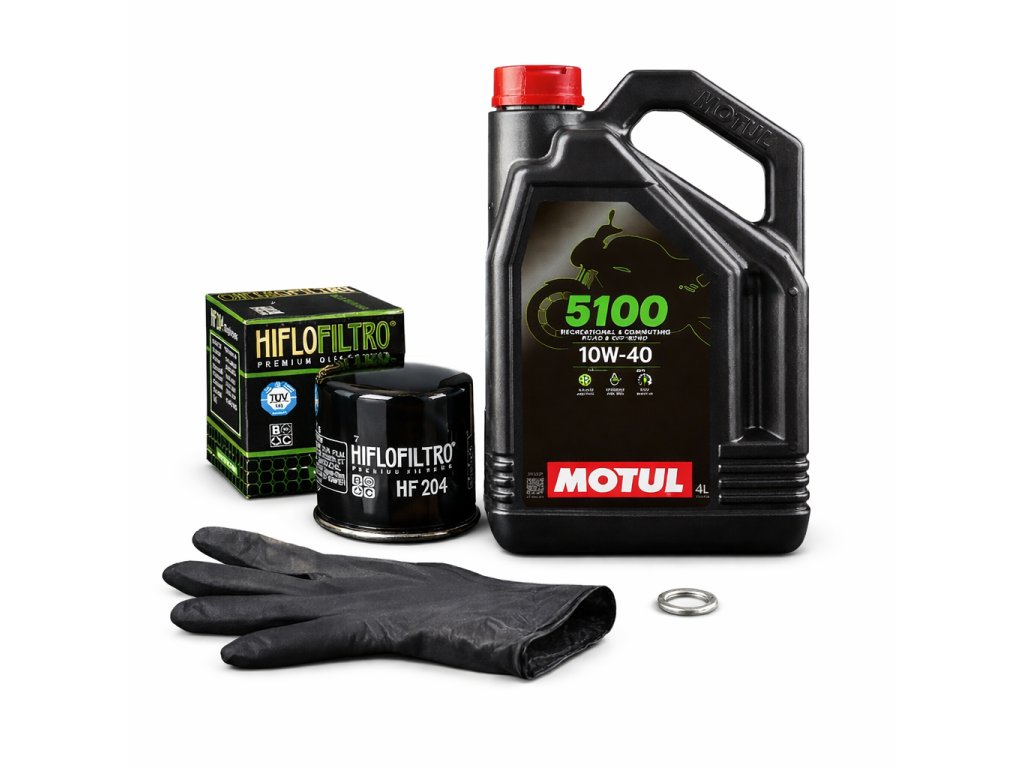 Praktická servisní sada pro kompletní výměnu motorového oleje u motocyklu. Obsahuje kvalitní polosyntetický olej Motul 5100 4T 10W-40, olejový filtr Hiflofiltro, těsnicí podložku pod vypouštěcí šroub oleje a jednorázové nitrilové rukavice. Díky této sadě máte vše potřebné pro rychlou a čistou výměnu oleje na jednom místě.