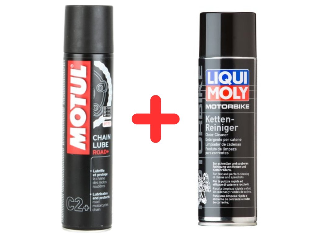 Sada obsahuje vysoce účinný čistič Liqui Moly Chain Clean (500 ml) a kvalitní mazivo Motul C2+ Chain Lube Road Plus (400 ml) určené pro silniční motocykly.